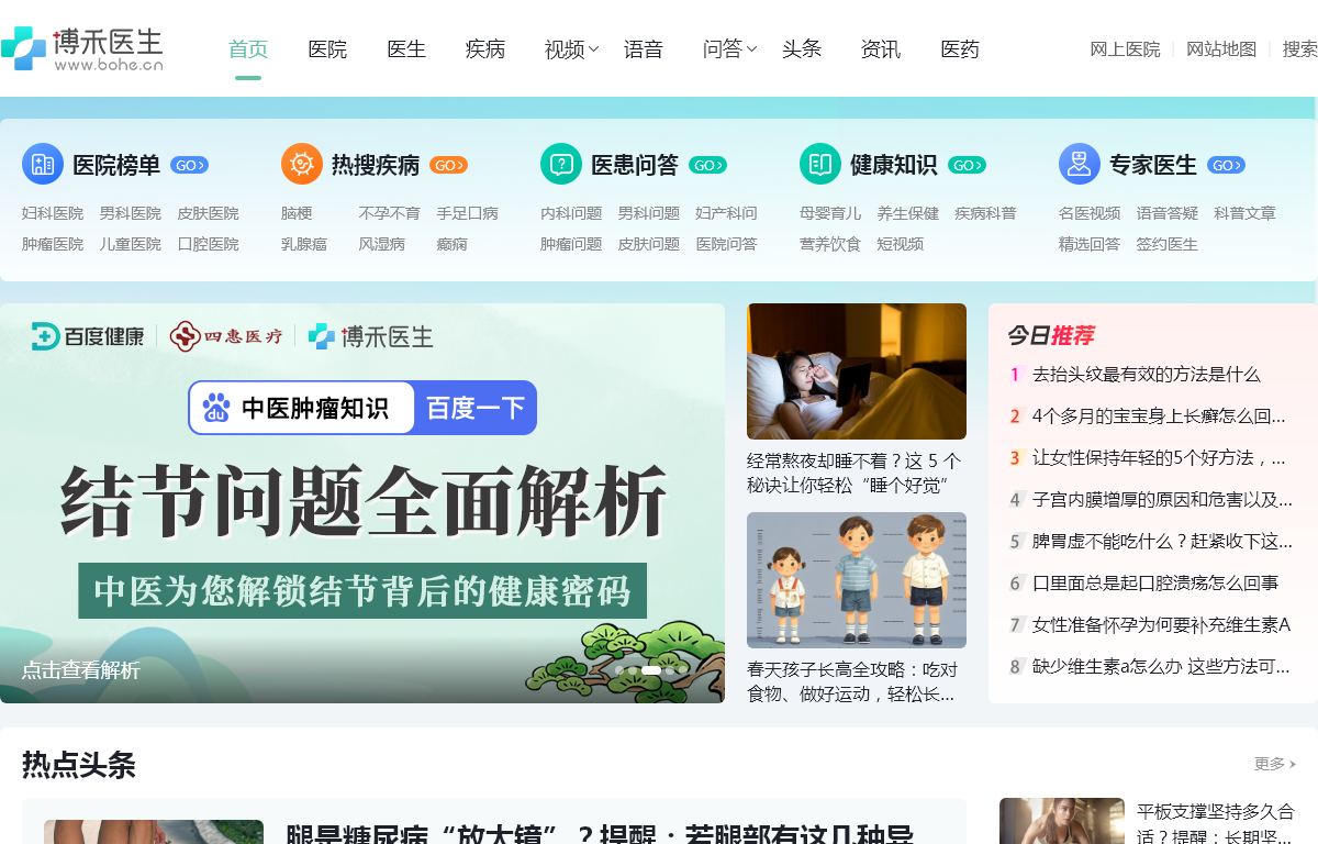 博禾医生汇聚全国TOP100三甲医院知名专家医生,专业打造权威的智慧医疗科普平台,通过视音频、直播问诊、专家文章、在线问医生等多形式内容,为大众用户提供专业、可信的科普医疗服务和就医指南。是国内领先的健康科普内容生产与提供商!